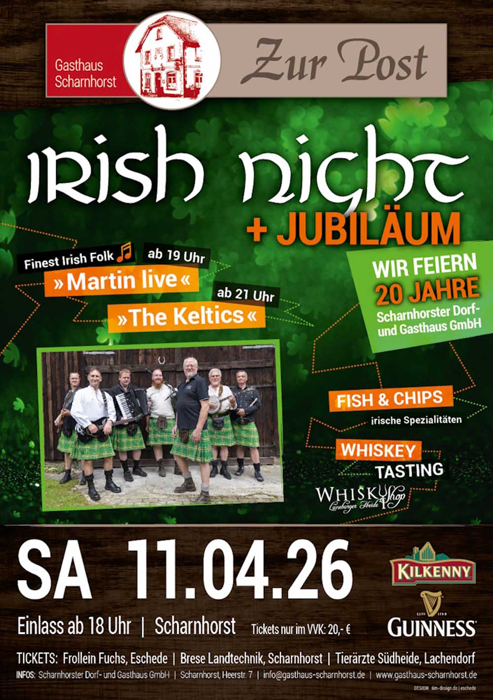 11.04.2026 18:00Öffentliche VeranstaltungenScharnhorst bei Eschede (Gasthaus)11.04.2026 18:00[Öffentliche Veranstaltungen]Irischer Abend 2026Infos des Veranstalters: